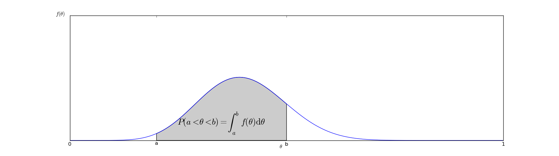 In graphical terms, the probability that \(@a < \theta < b\)@ can be interpreted as the area under the curve of the graph of \(@f(\theta)\)@: